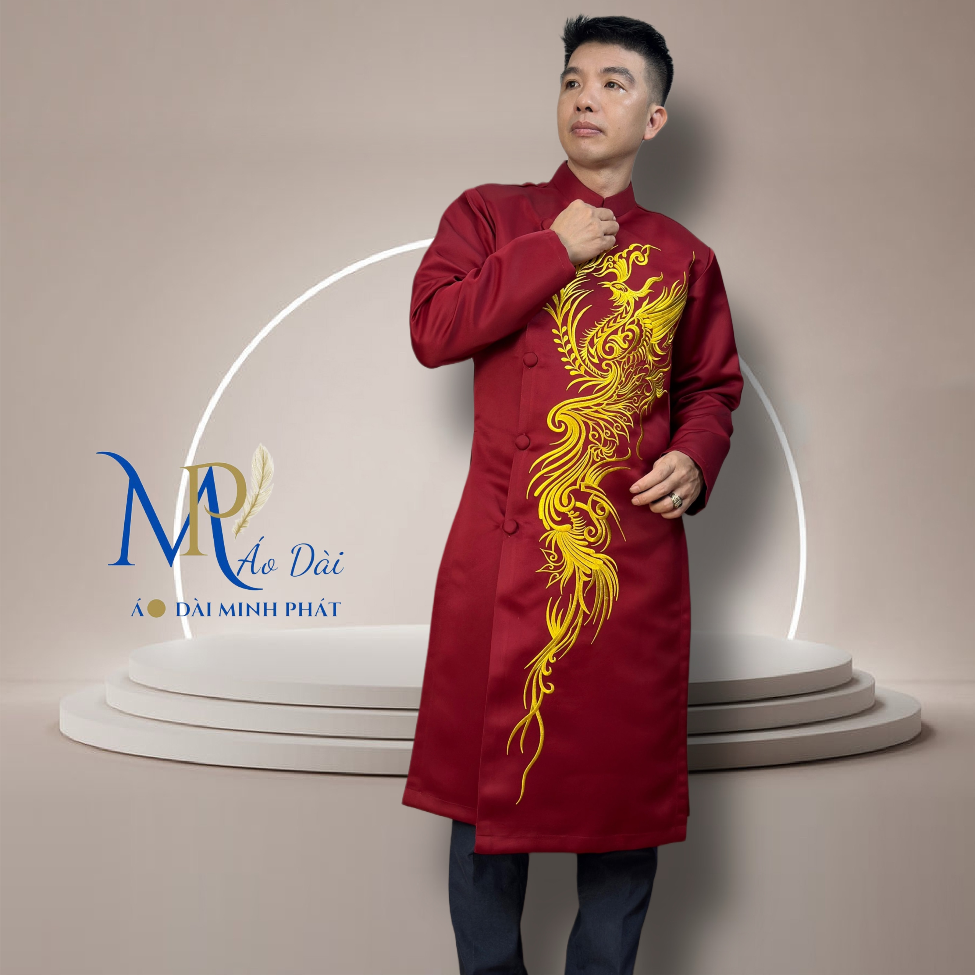 Áo Dài Minh Phát, áo dài nam cao cấp, áo dài cách tân form vest, áo dài rồng vàng thêu máy, áo dài vải tuyết mưa, áo dài nam dự tiệc sang trọng, áo dài thương hiệu Việt, Áo dài thêu phụng, Áo dà nam vải taffta cao cấp